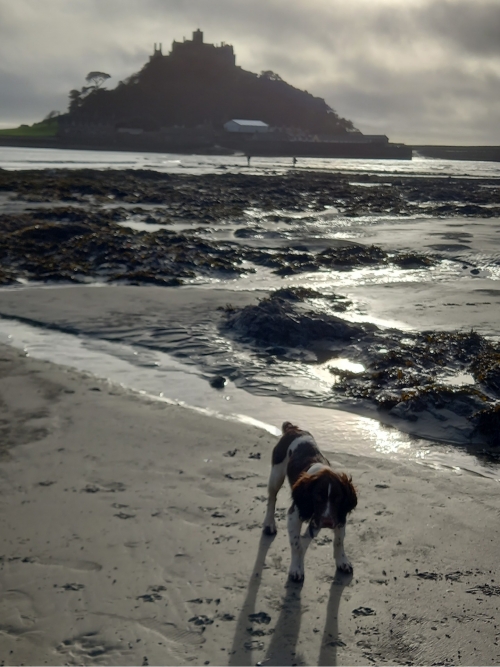 Popped down to Marazion beach today with our spaniel pup, Angus. What a lovely calm afternoon after the storms over Xmas and New Year. It feels far too warm to be January. Well, this is Cornwall i'm told! Wet and warm, which I really don't mind. Feeling incredibly lucky to have a view like St Michaels Mount just on a casual dog walk on a dull Monday afternoon.